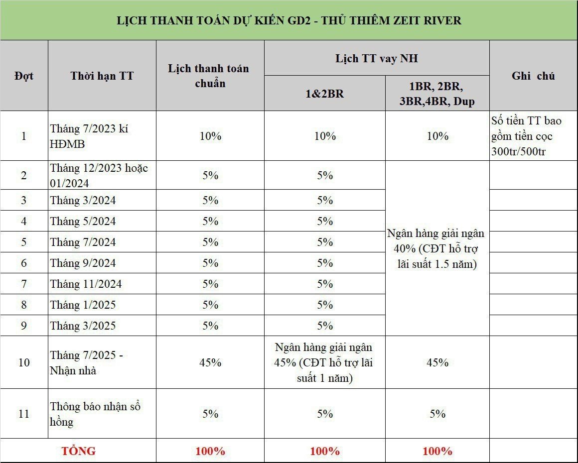 Phương thức thanh toán cho sản phẩm căn hộ Thủ Thiêm Zeit River đã được GS E&C công bố. Tiến độ thanh toán chậm (rất có lợi cho khách hàng mua). Giúp khách hàng có thể sắp xếp lại tài chính cá nhân, trả dần mà có thể sở hữu căn hộ ngay tại dự án.